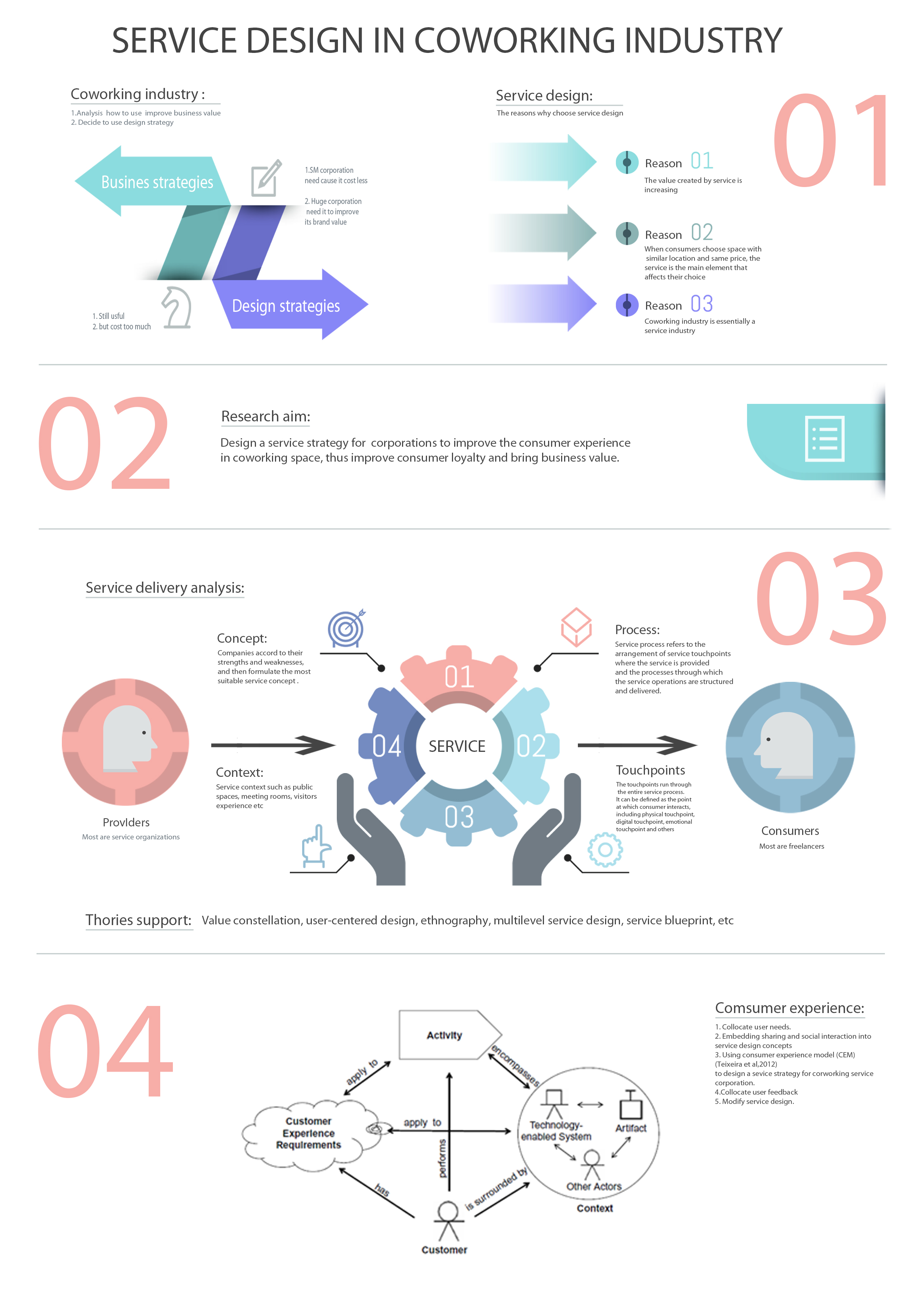 I chose this research area cause I had some experience with coworking design and design management. As a design manager, I always think about how to improve the business value of this industry by design. I try to find the answer from space design, branding design, and corporate identity. However, they do not make sense. I ask myself if you are a consumer, except convenient transportation, good environment, and cheap price, what else you want to get from coworking space. Finally, I moved to service design. Following are some fragment of my essay “service design in coworking industry”